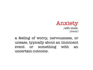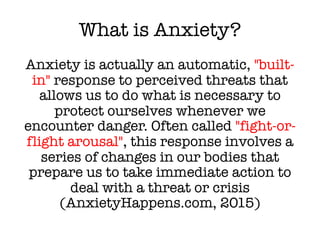 This document discusses anxiety, its causes and symptoms. It describes anxiety as a natural fight or flight response to perceived threats that allows us to protect ourselves. Prolonged anxiety can be physically and emotionally draining. The document provides tips for managing anxiety such as relaxation techniques like deep breathing, muscle relaxation, and grounding. It also discusses strategies for challenging anxious and negative thoughts through awareness, rational thinking, positive affirmations and realistic perspectives.