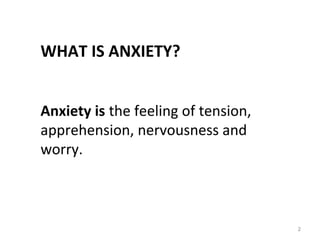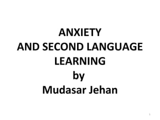 Foreign language anxiety is a distinct type of anxiety that is situation-specific and arises from the uniqueness of the language learning process. It can affect both anxious and non-anxious individuals. There are two types of language anxiety - debilitative anxiety which hinders learning, and facilitative anxiety which benefits learning by keeping students alert. Sources of foreign language anxiety include speaking in front of peers and fear of making errors. High foreign language anxiety has detrimental effects on students' performance, confidence, and participation, and can negatively impact communication outside the classroom.