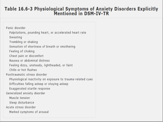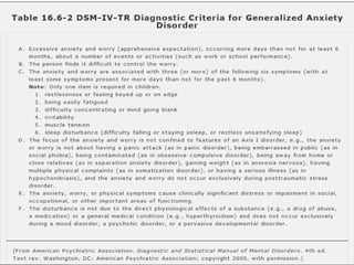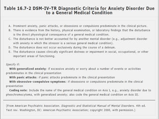 Generalized Anxiety Disorder is a common condition affecting 3-8% of the population annually. It involves excessive, uncontrollable worry about everyday life events. Biological factors like the GABA and serotonin systems are involved. Treatment involves psychotherapy, pharmacotherapy like SSRIs, and lifestyle changes. The disorder commonly co-occurs with other conditions like depression and is more prevalent in women. Medical conditions can also cause anxiety disorder-like symptoms.
