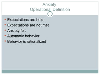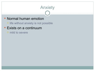 Anxiety is a normal human emotion that exists on a continuum from mild to severe. It is characterized by expectations not being met and the automatic rationalization of behaviors. Symptoms of anxiety include emotional, cognitive, and physical manifestations. Anxiety disorders affect around 25% of the population and have various theories around their causes including genetic, biological, cognitive-behavioral, and psychosocial factors. Common anxiety disorders include generalized anxiety disorder, panic disorder, phobic disorders, obsessive-compulsive disorder, post-traumatic stress disorder, and dissociative disorders. Treatment involves multidisciplinary interventions such as cognitive-behavioral therapy, medications, and observing nonverbal behaviors and relief patterns.
