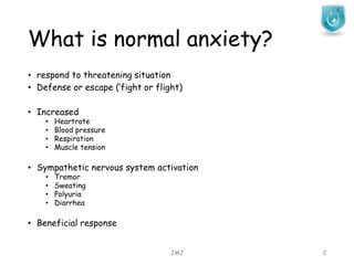 This document discusses various anxiety disorders including generalized anxiety disorder, phobic anxiety disorder, social phobia, agoraphobia, and panic disorder. It provides information on the prevalence, clinical features, course, differential diagnosis, etiology and treatment options for each disorder. The treatment options discussed include pharmacological interventions like antidepressants and anxiolytics as well as psychological therapies such as cognitive behavioral therapy and exposure therapy.
