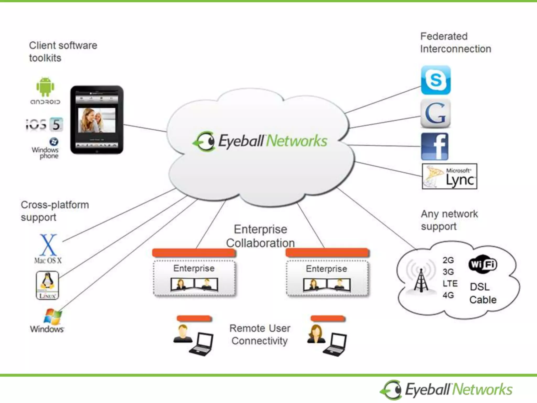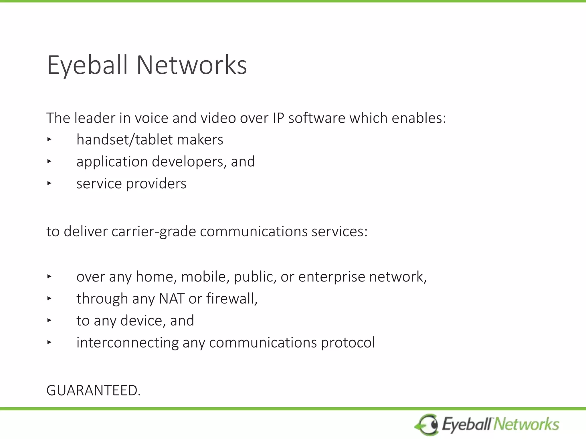 Eyeball Networks specializes in voice and video over IP software that enables device-to-device connectivity across various networks and protocols, supporting over 100 million users globally. Founded in 2002, the company provides solutions for handset makers, app developers, and service providers with an extensive patent portfolio that complies with key IETF standards. The Anyfirewall technology ensures guaranteed connections and enables communications for enterprise, government, and consumer customers worldwide.