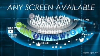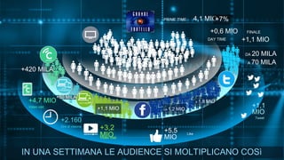 Il documento riporta dati sulle visualizzazioni video e l'engagement sui social media in un periodo di luglio 2014. Le audience sono aumentate significativamente, con picchi di 100 mila visualizzazioni e oltre 4,7 milioni di video visti in prime time. Si evidenziano anche incrementi di like e tweet, con un totale di 8 milioni di tweet in una settimana.