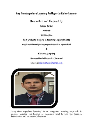The document discusses the concept of 'any time anywhere learning' as an integrated educational approach that breaks down barriers to maximize children's learning experiences. It emphasizes the importance of creating supportive and nurturing environments where children can learn at their own pace, acknowledging their unique backgrounds and developmental needs. The role of educators is highlighted as essential in fostering this kind of learning, adapting strategies to individual learners, and nurturing each child's potential to develop into integrated human beings.