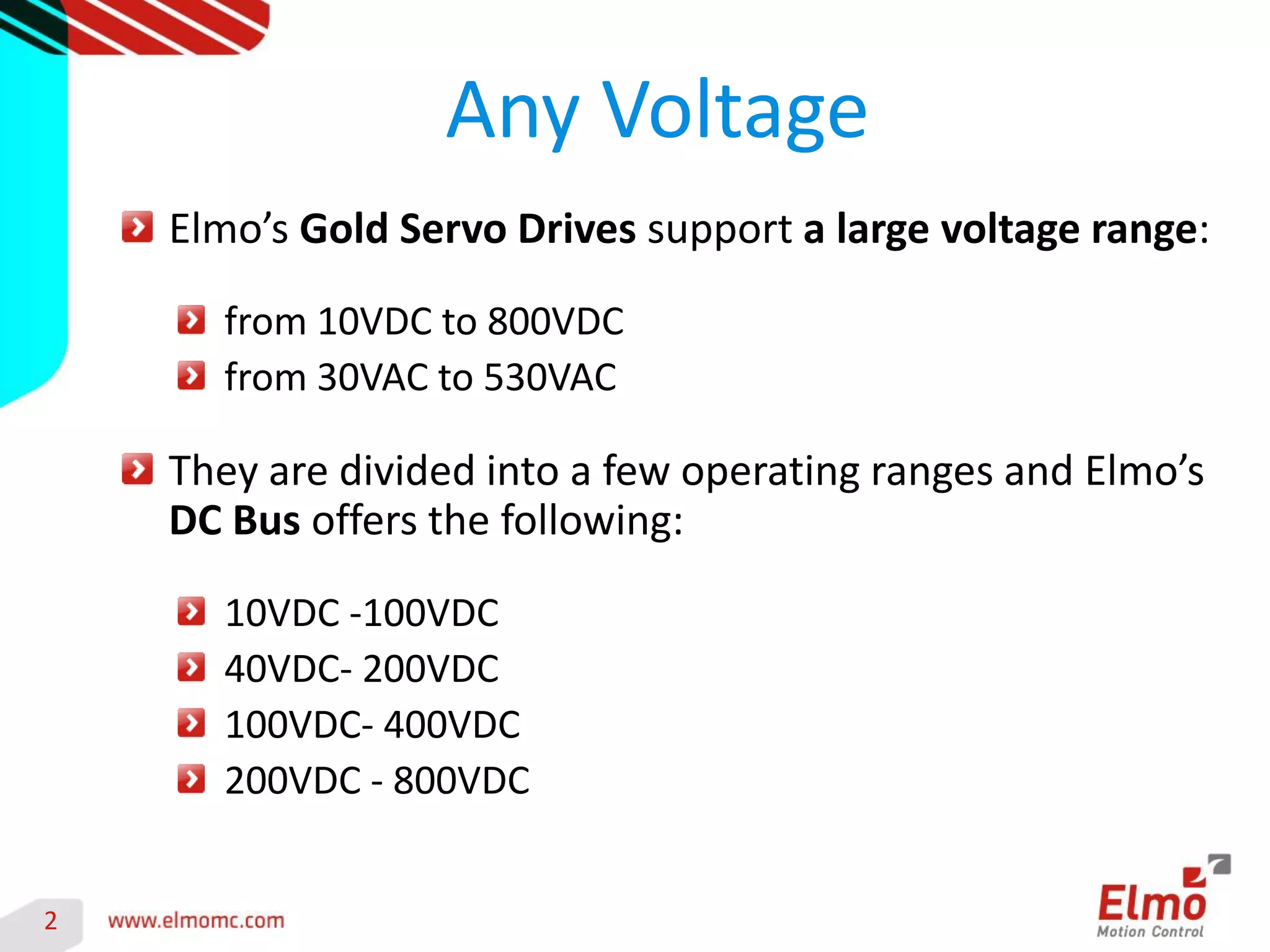 Elmo's gold servo drives support a wide voltage range for various applications, from 10VDC to 800VDC and 30VAC to 530VAC, with specific configurations for efficiency in high current drives. The document discusses the importance of power supply standards and suggests using a shared DC bus for systems with multiple axes, emphasizing its benefits in efficiency, cost, and resource utilization. Additionally, it highlights considerations for selecting voltage based on motor needs and application constraints, advocating for direct-to-mains solutions when feasible.