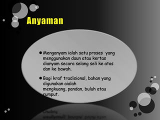 Dokumen ini menjelaskan langkah-langkah untuk membuat anyaman menggunakan potongan kertas warna. Terdapat delapan langkah yang mencakup pengukuran, pemotongan, penyusunan, dan penggabungan kertas. Alat dan bahan yang diperlukan termasuk kertas warna, alat tulis, gam, dan gunting.