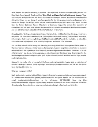 The document discusses how anything is possible when you have clear goals and a plan, passion, and effective communication skills. It shares the story of the author achieving his goal of becoming a professional motivational speaker by giving a speech in Trinidad. Throughout the document, the author emphasizes having dreams and passion, and shares experiences of how he pursued his goals and overcame challenges.