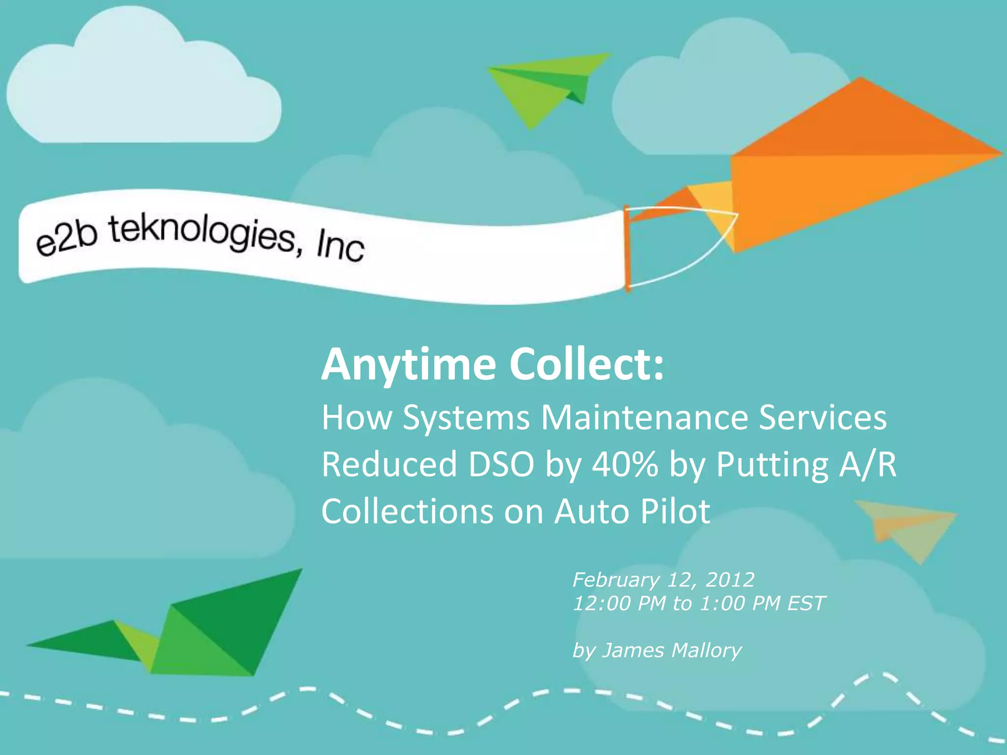 Systems Maintenance Services implemented Anytime Collect collections software to automate their accounts receivable collections process. This resulted in a 40% reduction in days sales outstanding (DSO) and allowed one credit manager to reallocate 50% of their time to other tasks. The company was able to collect more cash than they invoiced in 2012 after implementing the new software. The automated system provided visibility into accounts and standardized the collections process.