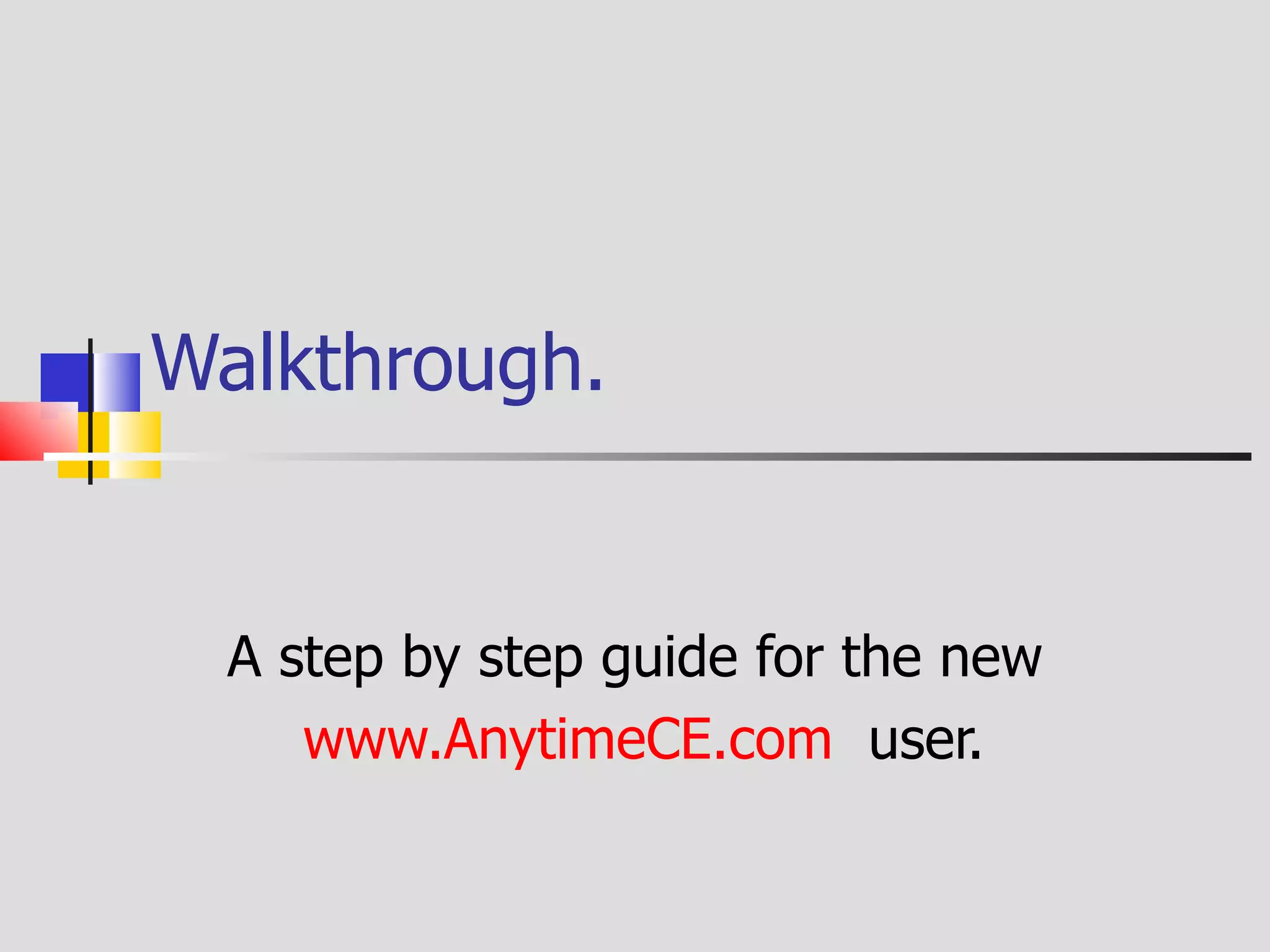 The document is a step-by-step guide for new users of www.anytimece.com, detailing how to select approved states and courses for continuing education. It outlines the process of registering, purchasing, accessing, and taking a course, as well as the requirement specifics for trade professionals like electricians and plumbers in Washington state. Additionally, it introduces course types, quiz procedures, and completion notifications to the appropriate authorities upon course completion.
