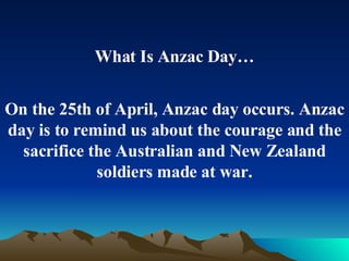 Anzac Day commemorates the Australian and New Zealand soldiers who fought in wars. It occurs every year on April 25th to honor the courage and sacrifices of the ANZACs who landed at Gallipoli, Turkey in 1915. Many soldiers were killed in the battle of Gallipoli. On Anzac Day, people attend memorial services and observe a minute of silence to remember those who died in war. The day aims to ensure we never forget the ANZAC soldiers and their efforts in military conflicts.