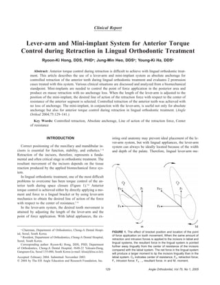 The document discusses a lever-arm and mini-implant system designed to achieve controlled anterior torque during retraction in lingual orthodontic treatment. This system provides absolute anchorage, allowing for effective tooth movement without loss of anchorage, which is crucial in managing the retraction of anterior teeth. The study evaluates two clinical cases demonstrating the system's biomechanical advantages and its successful application in orthodontic treatment.