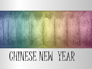 Chinese New Year, also known as the Lunar New Year or Spring Festival, is the most important celebration in Chinese culture. It occurs between January 21st and February 19th on the lunar calendar. Traditional celebrations include spending time with family, decorating homes with flowers and lanterns, and eating foods like pork, fish, and dumplings for good fortune in the coming year. The date is determined by a twelve-year cycle of animals in the Chinese zodiac that are each associated with different personality traits.