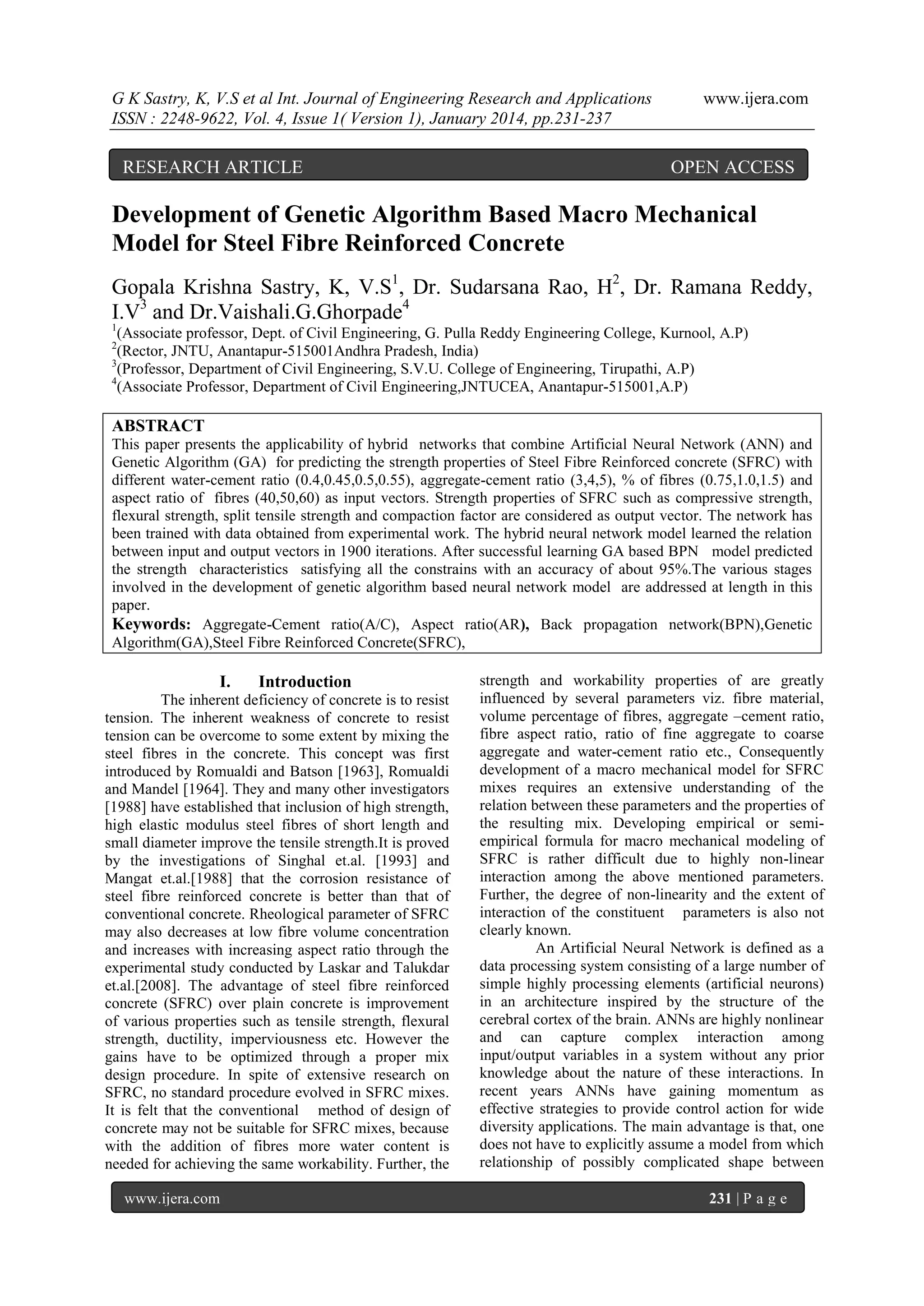 The document discusses the development of a genetic algorithm-based neural network model to predict the strength properties of steel fiber reinforced concrete (SFRC) using various input parameters such as water-cement ratio, aggregate-cement ratio, fiber percentage, and fiber aspect ratio. The model demonstrated a 95% accuracy in predicting compressive, flexural, and split tensile strengths after being trained on 108 experimental data sets. The paper emphasizes the advantages of combining artificial neural networks and genetic algorithms to effectively map the complex interactions among the various factors affecting SFRC properties.