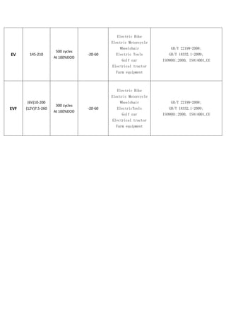 The document outlines specifications for various lead-acid battery models including their capacity range in Ah, design life in years at 250C, operating temperature range in 0C, applicable certifications, and potential applications. Models include FM, GFM, GFM-F, GFM-D, GFM-G, EV, and EVF batteries suitable for uses in UPS systems, emergency lighting, telecommunications, solar/wind power, marine/boat, electric vehicles, power tools, and more. All models meet certifications such as ISO9001, ISO14001, OHSAS18001, CE, IEC 60095, and various Chinese/European standards.