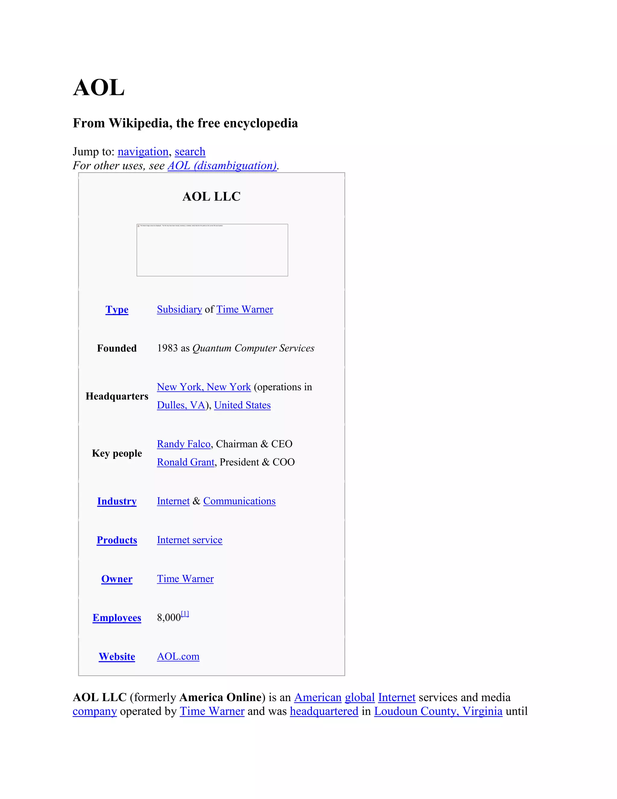 AOL LLC is an American global internet services and media company operated by Time Warner. It was founded in 1983 as Quantum Computer Services and launched America Online in 1991, growing to over 30 million subscribers worldwide by providing internet access and online communities. In 2000, AOL merged with Time Warner in a $350 billion deal, but has since seen its subscriber base and value decline dramatically as it transitioned to focus on content over internet services. It is now focused on becoming a content provider like Yahoo through services like TMZ.com.