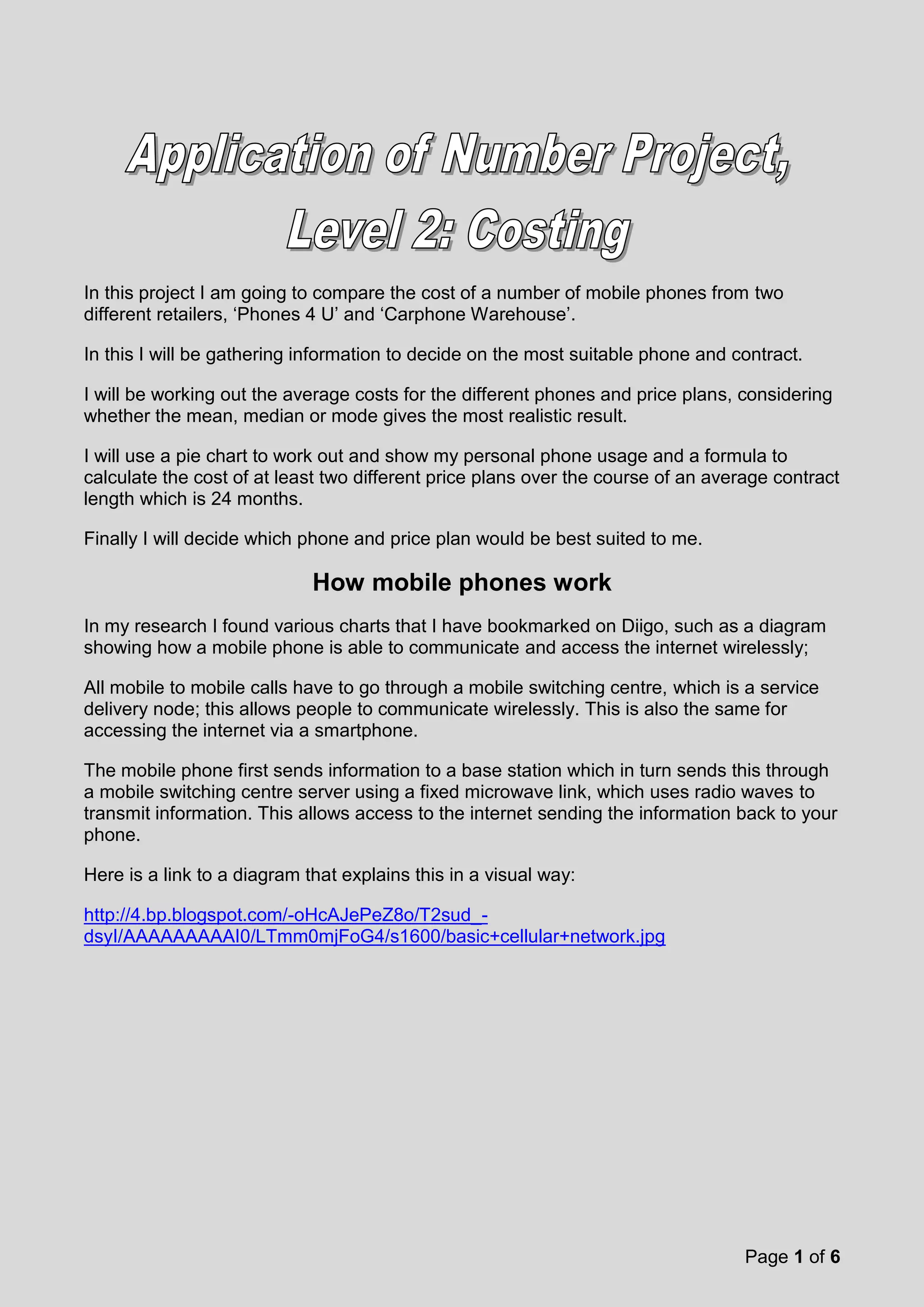 This document summarizes a student project comparing the costs of mobile phones and contracts from two retailers, Phones 4 U and Carphone Warehouse. The student gathered specifications for several phones, compared monthly tariffs for contracts, calculated total costs over 24 months, and analyzed their own phone usage. Based on lower prices at Carphone Warehouse and sufficient storage, the student concluded the iPhone 5c would be the best choice.