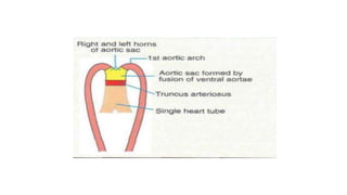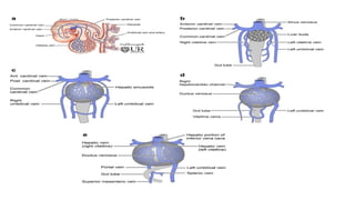 The document summarizes the development of the aortic arch, thoracic and abdominal aorta, and venous system during embryogenesis. It describes how the paired dorsal aortas fuse to form the descending aorta and how the aortic arches give rise to major arteries like the carotid and subclavian arteries. Common aortic arch anomalies are discussed along with the regression of embryonic veins and formation of major veins like the inferior vena cava from segments including the vitelline, umbilical, and cardinal veins. Rare anomalies of the venous system and arterial variations are also mentioned.