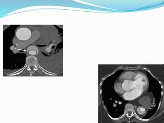 2. Key CT findings include an intimal flap that separates the true and false lumens, as well as complications such as periaortic hematoma.