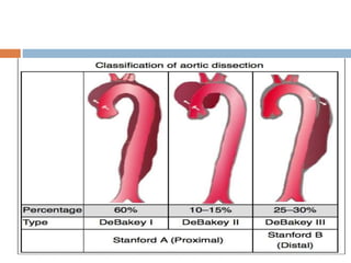 An aortic dissection occurs when blood tears the inner layer of the aorta, separating it from the middle layer. It is classified by location and timing of symptoms. Risk factors include hypertension, connective tissue disorders, and family history. Treatment depends on location but may include surgery, endovascular stent grafting, or medical management of blood pressure. Prognosis depends on type and treatment, with mortality rates declining with advances in surgical and endovascular techniques.