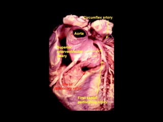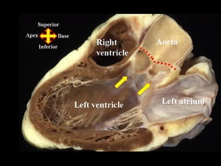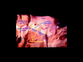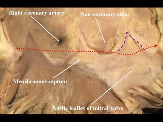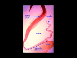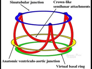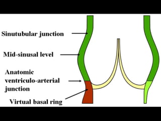 The document discusses the surgical anatomy of the aortic root. It notes that the aortic root extends from the basal attachments of the aortic valve leaflets within the left ventricle to the sinutubular junction. The aortic root provides the supporting structures for the leaflets and is made up of the aortic valve sinuses along with intersinusal fibrous triangles and small crescents of ventricular muscle at its proximal end. The root is wider at the midpoint of the sinuses than at either end, and proper measurements of the root can only be taken at the bottom of the leaflet attachments, widest point of the sinuses, and sinutubular junction.