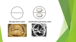 Aortic stenosis is a narrowing of the aortic valve opening that obstructs blood flow from the heart into the aorta. It has several causes including a congenitally abnormal bicuspid aortic valve, age-related degeneration and calcification of the valves, or rheumatic heart disease. Diagnosis involves echocardiography to measure the severity based on aortic valve area and pressure gradients. Severe aortic stenosis carries a poor prognosis without intervention, with 50% mortality within 3 years of symptom onset. Treatment options include surgical aortic valve replacement or the minimally invasive transcatheter aortic valve replacement procedure.