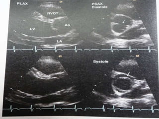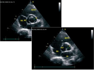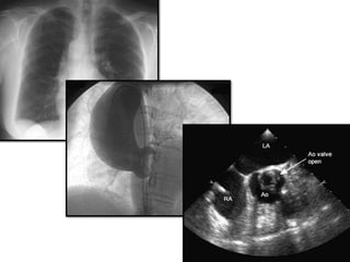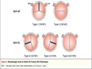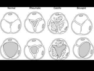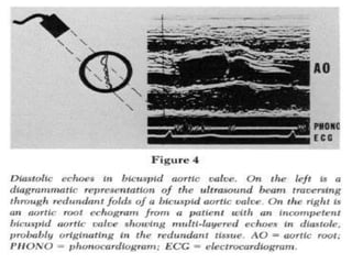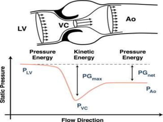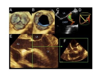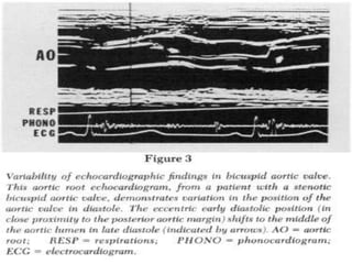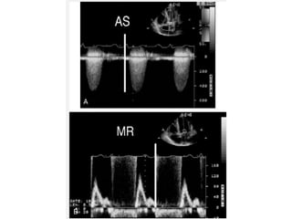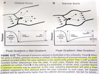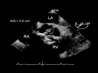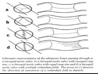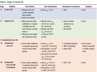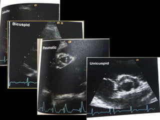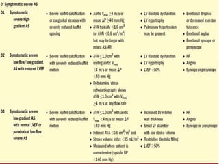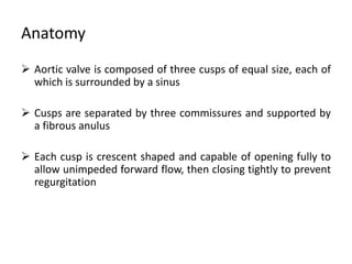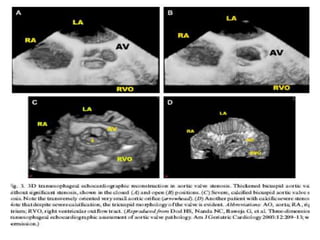 The document provides details on the anatomy and evaluation of aortic stenosis using echocardiography. It describes the normal aortic valve anatomy and how various types of aortic stenosis like calcific, rheumatic, bicuspid and subvalvular present on echo. Quantitative assessment of aortic stenosis severity is done using Doppler ultrasound to measure the maximum jet velocity and calculate the pressure gradient across the stenotic valve.