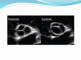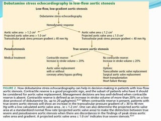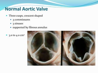 This document summarizes the evaluation of aortic valve stenosis using echocardiography. It describes the normal aortic valve anatomy and various types of aortic valve stenosis including calcific, bicuspid, rheumatic, and supravalvular or subvalvular stenosis. Doppler echocardiography is used to evaluate aortic valve stenosis severity based on valve area, mean gradient, and peak jet velocity. Stress echocardiography with dobutamine can help distinguish true severe from pseudo-severe low-flow, low-gradient aortic stenosis.