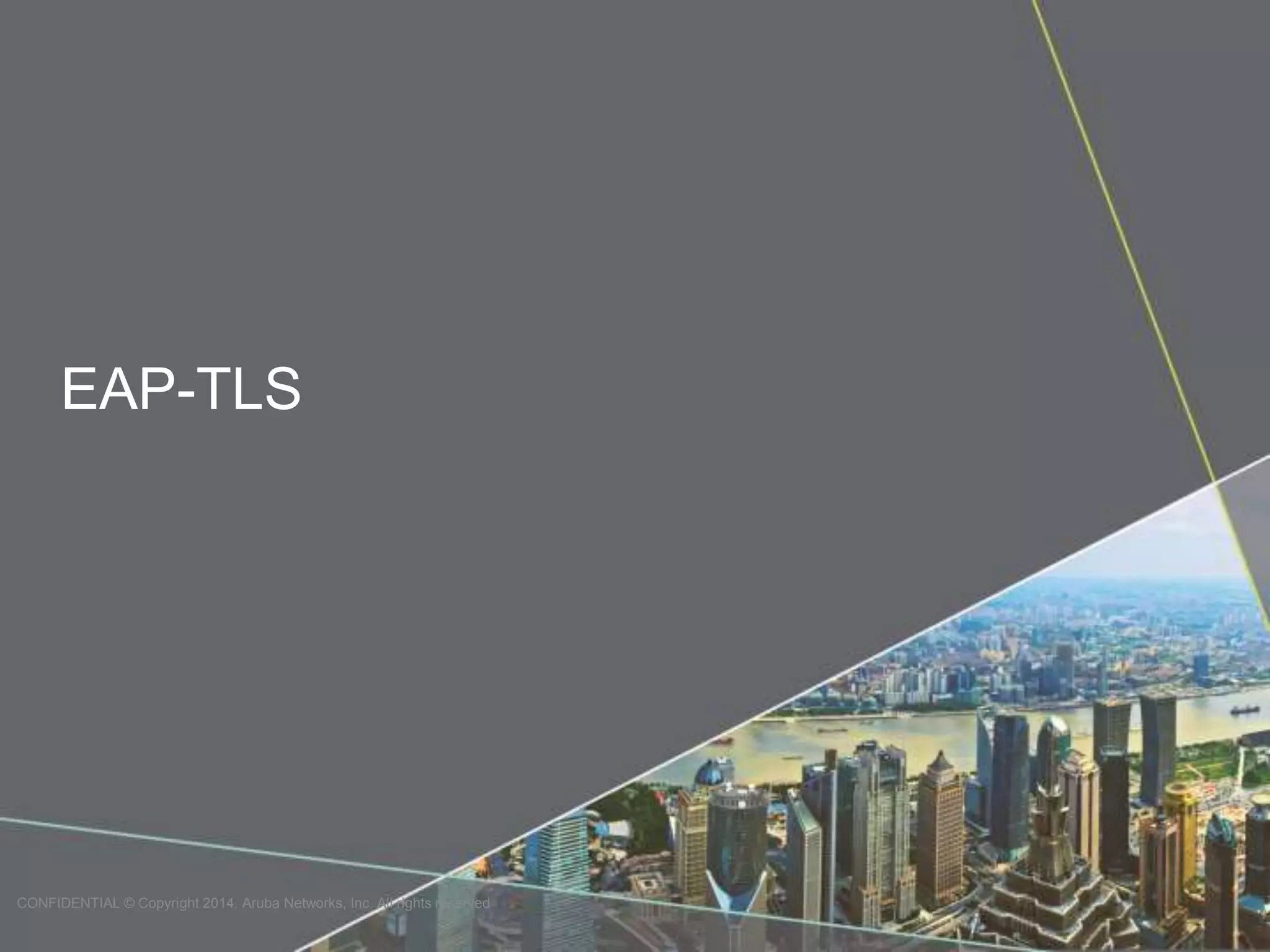 The document discusses the configuration and testing of EAP-TLS and EAP-PEAP authentication between an Aruba controller and CPPM authentication server. It provides step-by-step instructions on setting up EAP-TLS and EAP-PEAP when the EAP tunnel is terminated on the CPPM server or Aruba controller. Troubleshooting tips are also included such as ensuring the correct certificates, authentication methods and services are configured on the controller, CPPM and client devices.