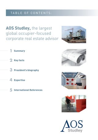 AOS Studley is the largest global corporate real estate advisor focused solely on representing tenants. It has over 950 employees across 30 countries. The document provides details on AOS Studley's expertise in tenant representation, workplace consulting, project management, and strategic consulting. It also includes international case studies and references for clients such as Carrefour, Microsoft, and SwissLife.