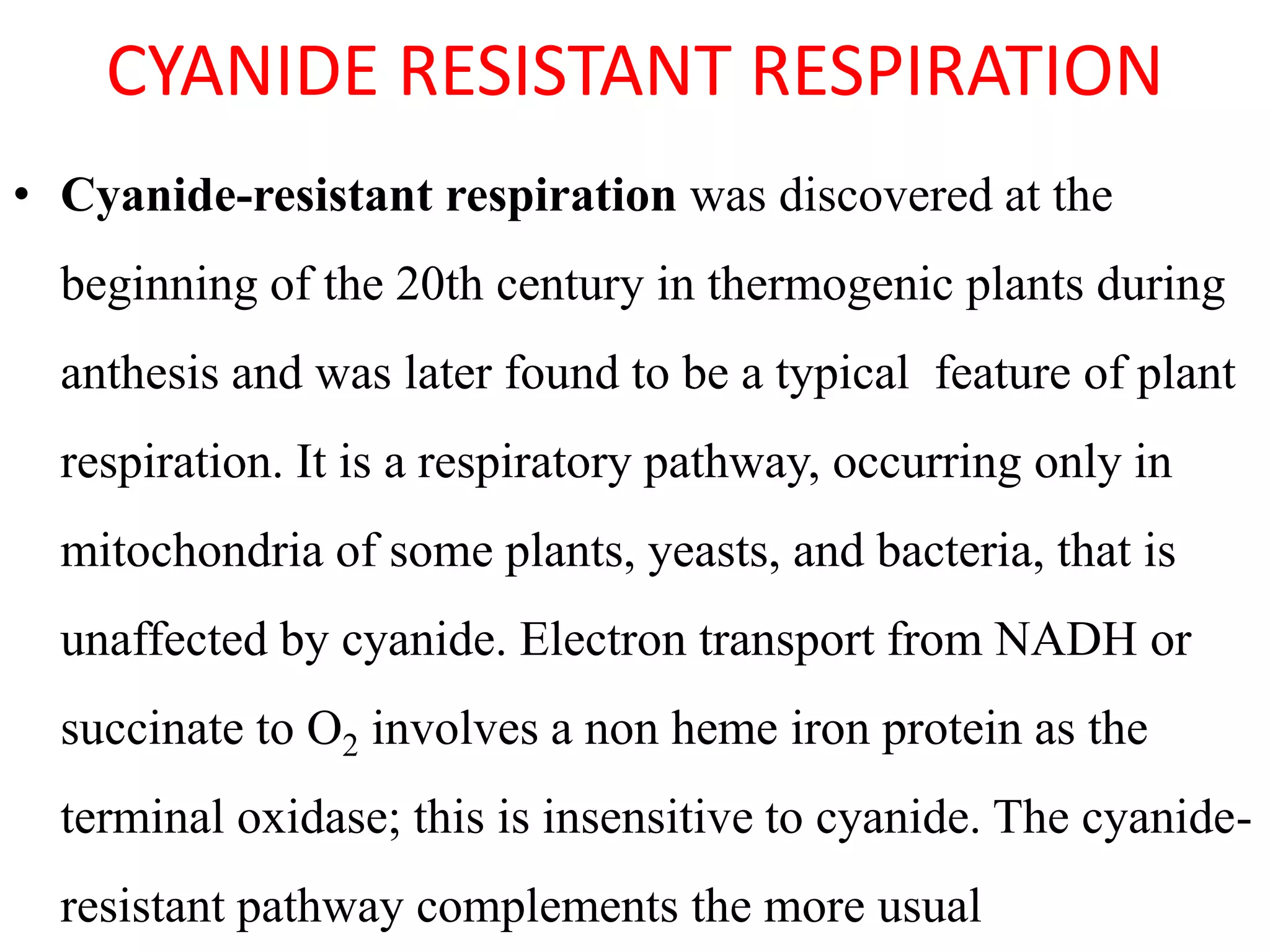 Cyanide-resistant respiration is a respiratory pathway that occurs in some plant, yeast, and bacteria mitochondria that is unaffected by cyanide. It involves an alternative terminal oxidase instead of cytochrome oxidase. This alternative oxidase is a non-heme iron protein. Cyanide-resistant respiration provides an alternative pathway to the usual cyanide-sensitive respiration and is not found in animals. The alternative oxidase branches from the main respiratory chain and catalyzes the reduction of oxygen to water without pumping hydrogen ions, so it dissipates energy as heat rather than generating a proton gradient.