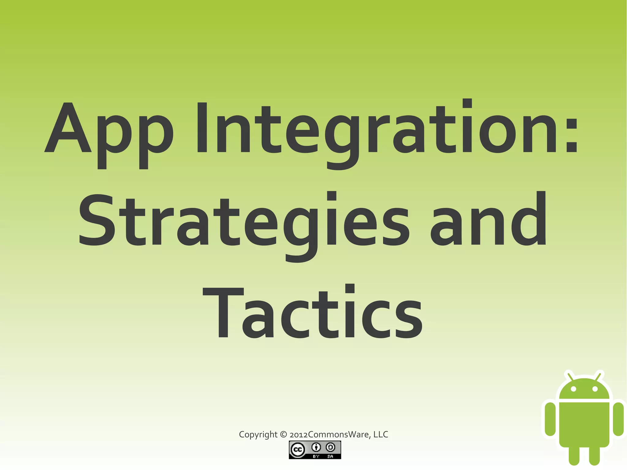 The document discusses various strategies for integrating third party applications into a mobile app. It describes integration models like peers, plugins, and activities using implicit and explicit intents. It also covers techniques for integrating user interfaces, resources, content providers, services, broadcasts, code, and discovery mechanisms. The key points are that integration can add value for users, third parties, and developers, but comes with challenges regarding permissions, documentation, and user discovery of integrations.