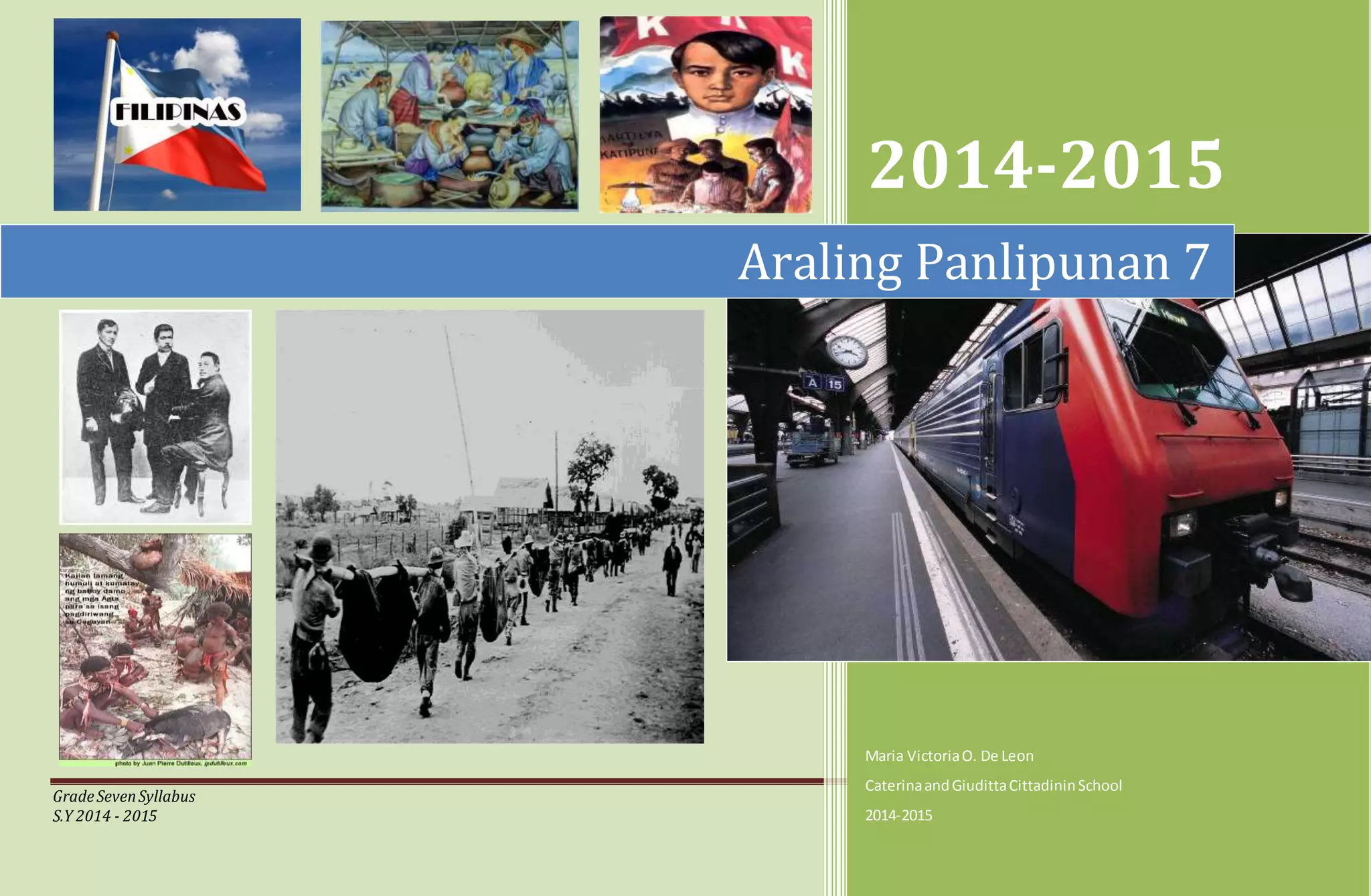 Ang dokumento ay isang syllabus para sa Araling Panlipunan ng ikapitong baitang para sa taong 2014-2015. Nakapaloob dito ang iba't ibang araling tumatalakay sa kasaysayan, kultura, at kabihasnang Pilipino, kasama ang mga layunin, mahahalagang katanungan, at mga gawain na dapat isagawa ng mga mag-aaral. Ang syllabus ay naglalayong linangin ang kaalaman ng mga estudyante sa mga pangunahing konsepto ng kasaysayan at kanilang kaugnayan sa kasalukuyan.