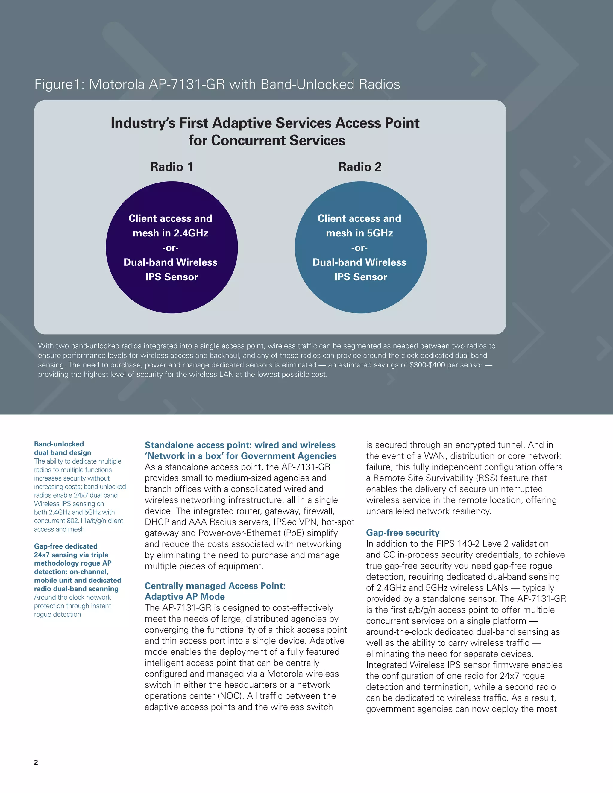 The document describes the Motorola AP-7131-GR, an 802.11n adaptive services access point that provides wireless connectivity, security, and management capabilities for government agencies. It has dual radios that allow it to simultaneously provide wireless access, mesh networking, and wireless intrusion prevention system sensing. It supports up to 600 Mbps wireless speeds and can operate as either a standalone access point or centrally managed by a wireless switch. Key features include FIPS 140-2 security validation, mesh networking, wireless intrusion prevention, and support for wireless voice and video applications.