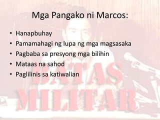 Ang dokumento ay naglalarawan sa mga pangako at aksyon ni Marcos sa ilalim ng batas militar mula 1972 hanggang 1985, kabilang ang pagbibigay ng mga oportunidad sa hanapbuhay at pamamahagi ng lupa, ngunit nagdulot din ng pagtaas ng presyo ng bilihin at karahasan. Ang deklarasyon ng batas militar noong Setyembre 21, 1972, ay nagpasimula ng malawak na paglabag sa mga karapatang pantao, kasama na ang pag-aresto sa mahigit 70,000 na mga politikong bilanggo. Ang mga pagkilos ni Marcos ay naglalayong patatagin ang kanyang kapangyarihan, habang ang kanyang pinamagatang