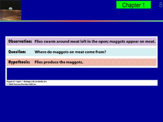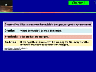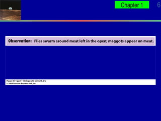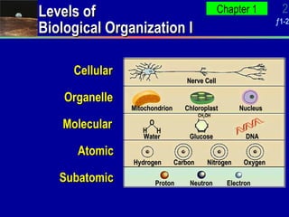 This document introduces key levels of biological organization from subatomic particles to ecosystems. It discusses the characteristics of living things including being complex, made of cells, obtaining energy and materials, responding to stimuli, growing, reproducing, and evolving over time. The scientific method and development of scientific theories are also outlined. Evolution is presented as the unifying theory of biology, with species adapting or going extinct based on environmental changes over millions of years.