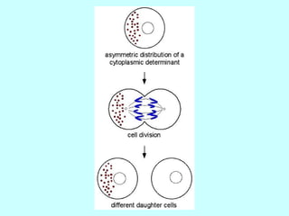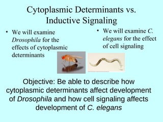 1. In Drosophila, maternal effect genes code for cytoplasmic determinants that establish the body axes and initial segmentation pattern through concentrations of proteins like Bicoid.