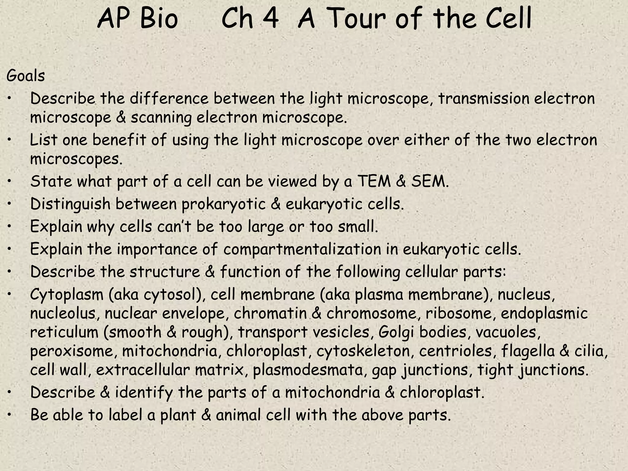 This document provides an overview of cells and cellular structures. It begins with an introduction to cells and explains that cells are the basic units of life. It then describes three types of microscopes used to view cells - light microscopes, transmission electron microscopes, and scanning electron microscopes - and notes one benefit of light microscopes. The document outlines the key differences between prokaryotic and eukaryotic cells and explains the importance of compartmentalization in eukaryotic cells. It provides descriptions and functions of major cellular structures and organelles found in plant and animal cells.