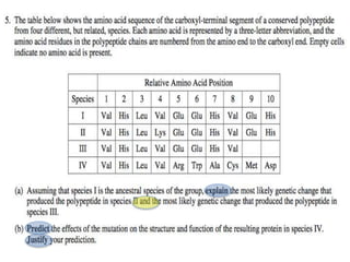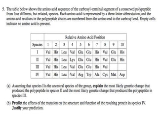 The document provides guidance on answering free response questions for the AP Biology exam. It advises students to (1) relate biological concepts to evidence and examples, (2) identify assumptions and limitations, and (3) connect techniques to their purpose. The document also defines common terms like "identify", "explain", and "compare and contrast" and encourages students to outline their answers using complete sentences. Scoring guidelines assess answers based on inclusion of key explanations, predictions, and justifications.