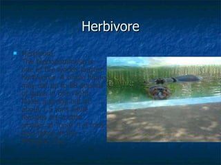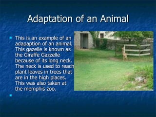 The document contains images and descriptions of various biology concepts. It provides examples of adaptations like a giraffe's long neck, herbivores like hippopotamuses, and species like meerkats. The examples are intended to illustrate different terms and were captured at locations like the Memphis Zoo, a grocery store, and someone's backyard.