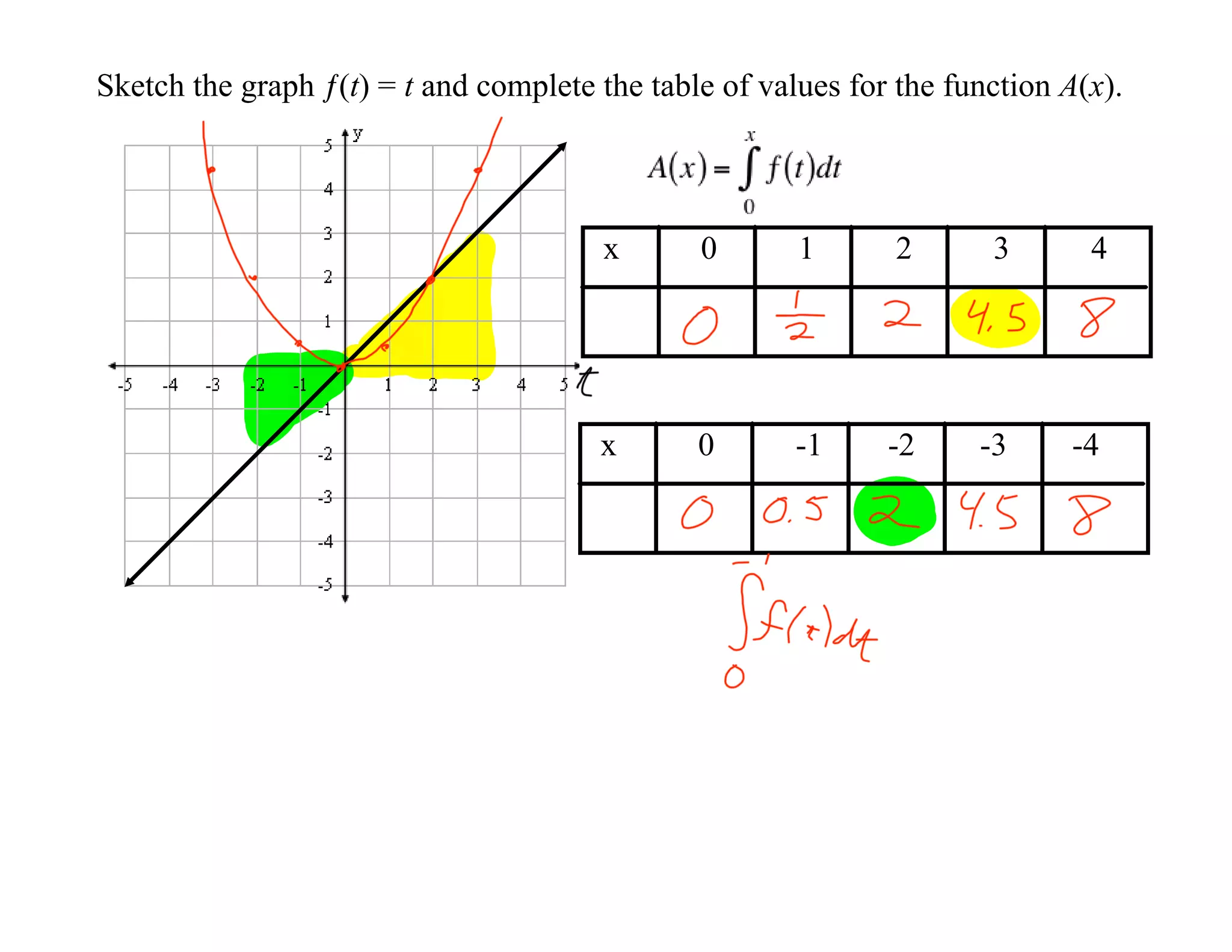 The document discusses accumulation functions and provides an example of sketching the graph of the function f(t)=t and using that to complete the table of values for the accumulation function A(x). It also mentions that the accumulation function will have the same domain as the integrand function and describes the sign convention used when the accumulation function makes sense for values left of the lower bound.