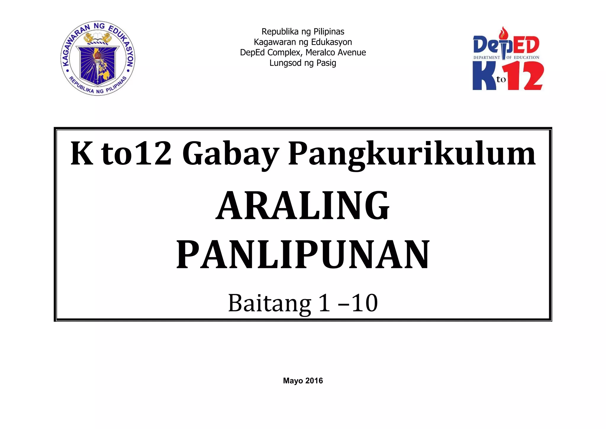 Ang dokumento ay isang gabay pangkurikulum para sa K to 12 Araling Panlipunan na naglalayong maglinang ng mga kakayahan sa mga mag-aaral mula baitang 1 hanggang 10 sa Pilipinas. Nakatuon ito sa mga mahahalagang tema tulad ng tao, lipunan, kapaligiran, kultura, karapatan, at ekonomiya, na kasama ang mga pangunahing konsepto at kasanayan sa pagsasaliksik at pagsusuri. Layunin ng kurikulum na hikayatin ang mga mag-aaral na magkaroon ng pambansa at pandaigdigang pananaw at pagpapahalaga sa mga isyu sa lipunan.