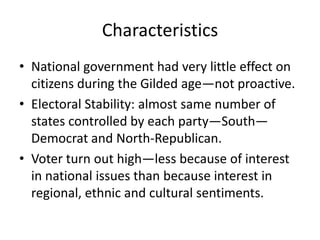 The Gilded Age in the United States was characterized by a weak federal government and strong political party machines controlled by bosses. Voter turnout remained high due to regional, ethnic, and cultural loyalties rather than national issues. The Republican Party drew support from big business, bankers, and Protestants in the North while the Democratic Party was stronger in the South with support from farmers, immigrants, and Catholics. Presidents made thousands of political appointments based on patronage rather than merit to reward their party machines. By the late 1800s, public frustration was growing over issues like high tariffs, trusts, and railroad abuses, signaling that changes were coming to disrupt the political balance of the Gilded Age.
