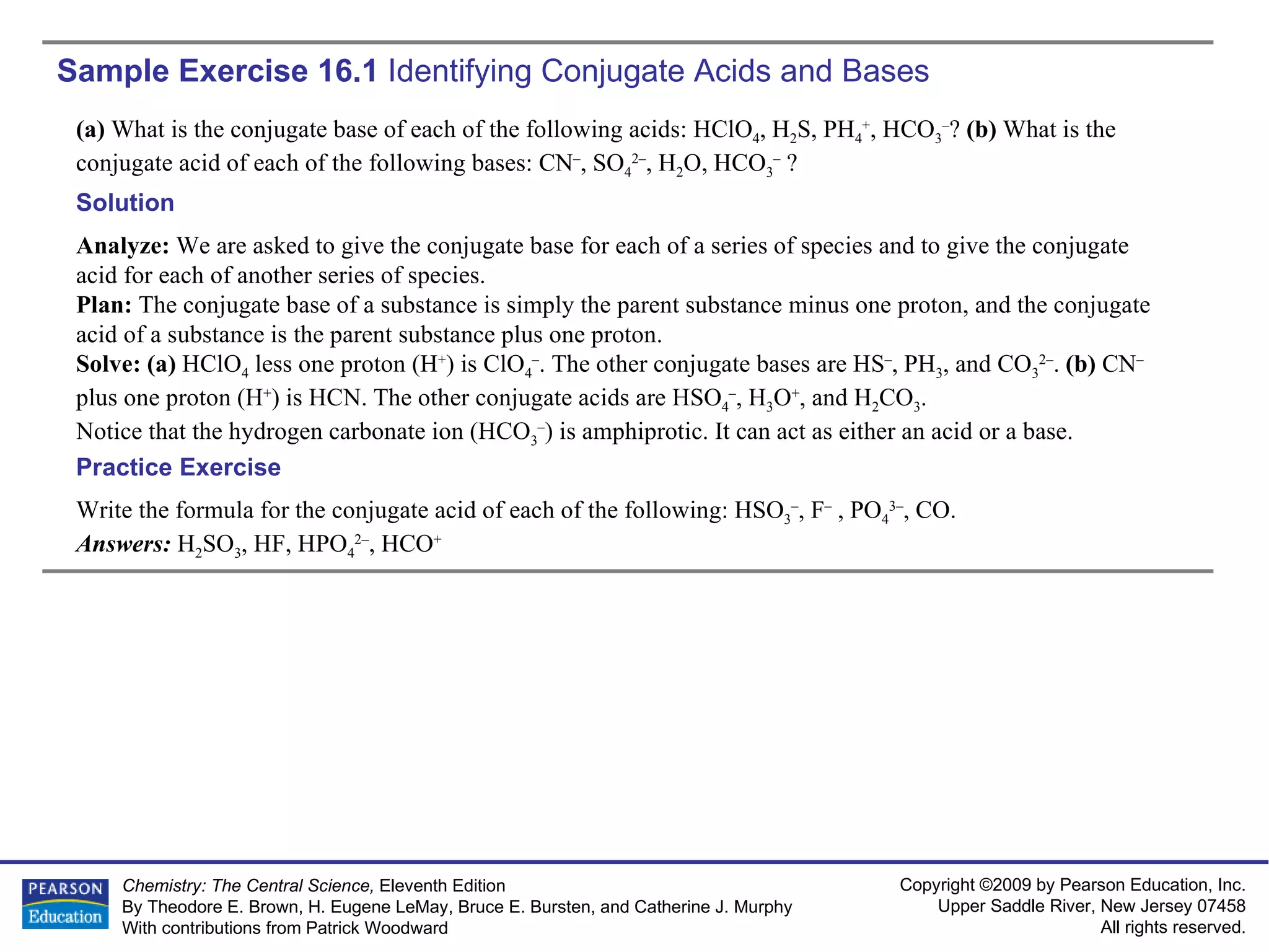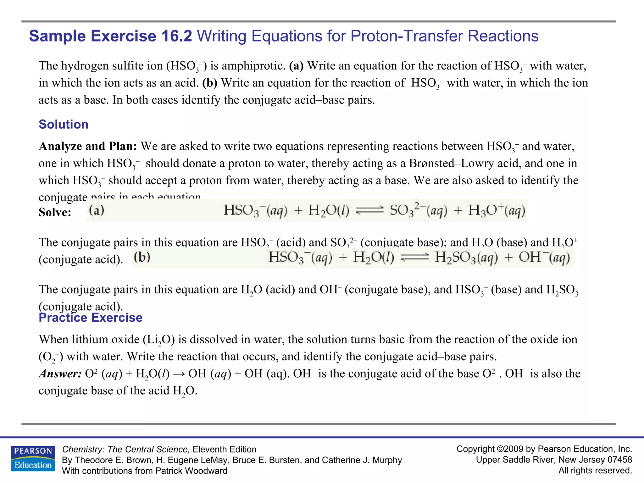 The document provides sample exercises for calculating concentrations of conjugate acids and bases, writing equations for acid-base reactions, and predicting equilibrium positions. It asks the reader to identify conjugate acid-base pairs, write equations, and use data like Figure 16.4 to determine if an equilibrium lies to the left or right. Multiple examples are provided and answered to demonstrate techniques for acid-base calculations and equilibrium predictions.