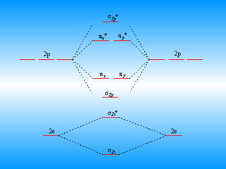 The document discusses molecular geometry and hybridization of atomic orbitals. It explains that the valence shell electron pair repulsion (VSEPR) model is used to predict molecular geometry based on electron pair repulsions. Molecular geometry is determined by the number of atoms bonded to the central atom and any lone pairs. Hybridization, such as sp, sp2, and sp3, is used to explain bonding based on the number of electron pairs around the central atom. Sigma and pi bonds are discussed, along with how hybridization relates to molecular geometry.