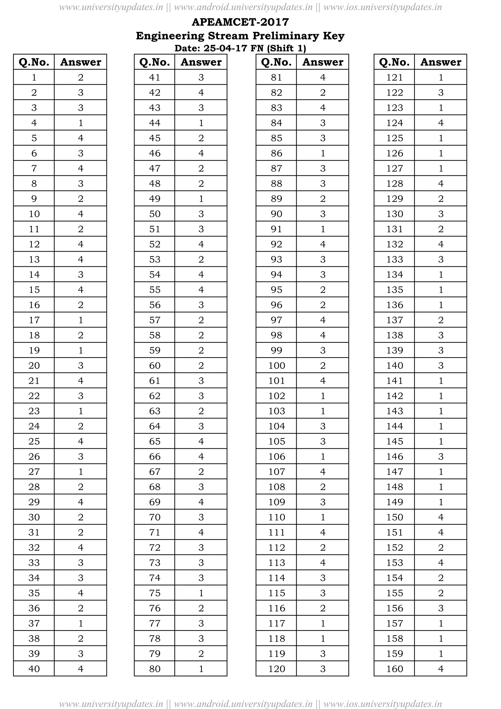 Answer Q.No. Answer Q.No. Answer 1 2 41 3 81 4 121 1 2 3 42 4 82 2 122 3 3 3 43 3 83 4 123 1 4 1 44 1 84 3 124 4 5 4 45 2 85 3 125 1 6 3 46 4 86 1 126 1 7 4 47 2 87 3 127 1 8 3 48 2 88 3 128 4 9 2 49 1 89 2 129 2 10 4 50 3 90 3 130 3 11 2 51 3 91 1 131 2 12 4 52 4 92 4 132 4 13 4 53 2 93 3 133 3 14 3 54 4 94 3 134 1 15 4 55 4 95 2 135 1 16 2 56 3 96 2 136 1 17 1 57 2 97 4 137 2 18 2 58 2 98 4 138 3 19 1 59 2 99 3 139 3 20 3 60 2 100 2 140 3 21 4 61 3 101 4 141 1 22 3 62 3 102 1 142 1 23 1 63 2 103 1 143 1 24 2 64 3 104 3 144 1 25 4 65 4 105 3 145 1 26 3 66 4 106 1 146 3 27 1 67 2 107 4 147 1 28 2 68 3 108 2 148 1 29 4 69 4 109 3 149 1 30 2 70 3 110 1 150 4 31 2 71 4 111 4 151 4 32 4 72 3 112 2 152 2 33 3 73 3 113 4 153 4 34 3 74 3 114 3 154 2 35 4 75 1 115 3 155 2 36 2 76 2 116 2 156 3 37 1 77 3 117 1 157 1 38 2 78 3 118 1 158 1 39 3 79 2 119 3 159 1 40 4 80 1 120 3 160 4 APEAMCET-2017 Engineering Stream Preliminary Key Date: 25-04-17 FN (Shift 1) www.universityupdates.in || www.android.universityupdates.in || www.ios.universityupdates.in www.universityupdates.in || www.android.universityupdates.in || www.ios.universityupdates.in