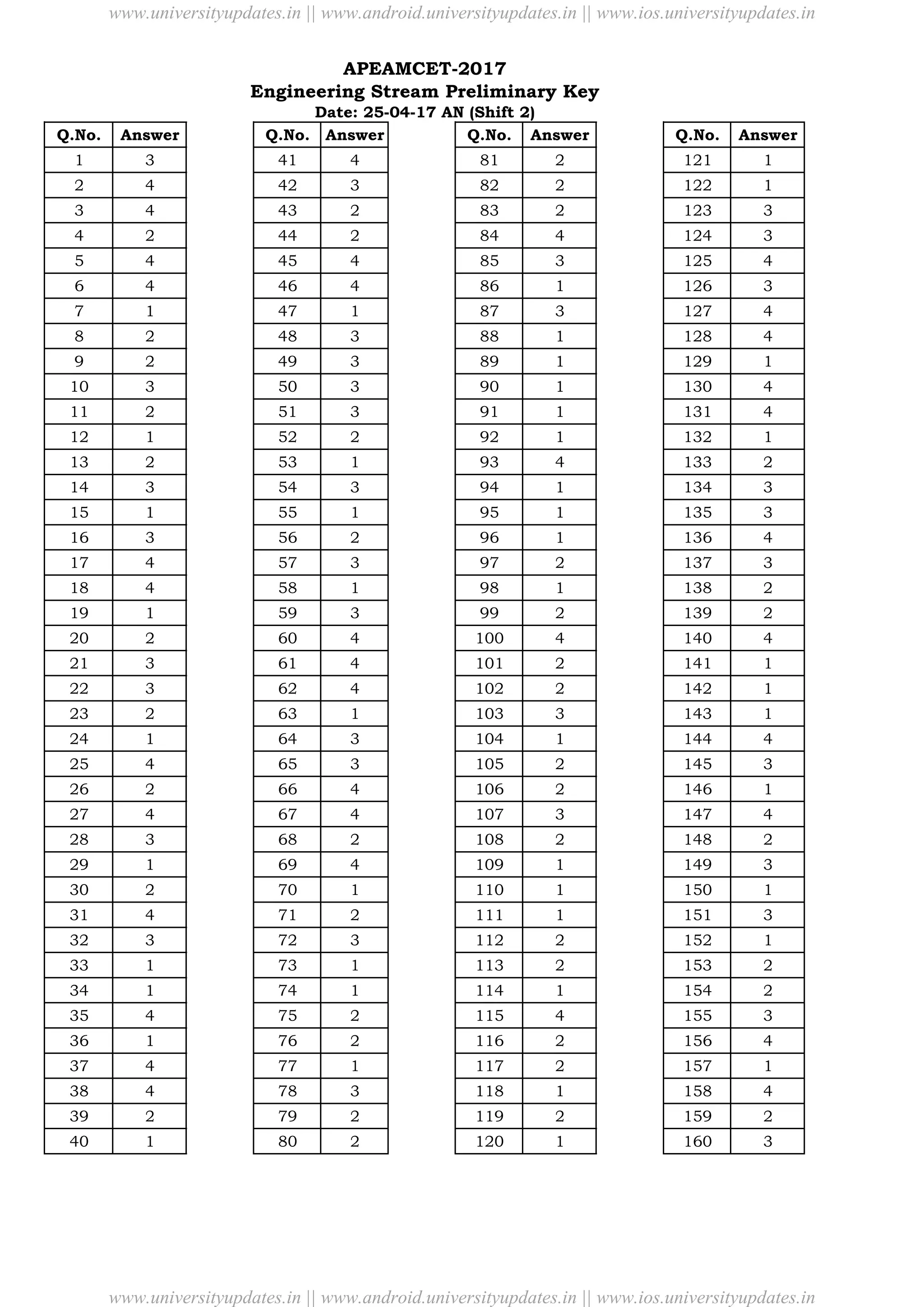 Answer Q.No. Answer Q.No. Answer 1 3 41 4 81 2 121 1 2 4 42 3 82 2 122 1 3 4 43 2 83 2 123 3 4 2 44 2 84 4 124 3 5 4 45 4 85 3 125 4 6 4 46 4 86 1 126 3 7 1 47 1 87 3 127 4 8 2 48 3 88 1 128 4 9 2 49 3 89 1 129 1 10 3 50 3 90 1 130 4 11 2 51 3 91 1 131 4 12 1 52 2 92 1 132 1 13 2 53 1 93 4 133 2 14 3 54 3 94 1 134 3 15 1 55 1 95 1 135 3 16 3 56 2 96 1 136 4 17 4 57 3 97 2 137 3 18 4 58 1 98 1 138 2 19 1 59 3 99 2 139 2 20 2 60 4 100 4 140 4 21 3 61 4 101 2 141 1 22 3 62 4 102 2 142 1 23 2 63 1 103 3 143 1 24 1 64 3 104 1 144 4 25 4 65 3 105 2 145 3 26 2 66 4 106 2 146 1 27 4 67 4 107 3 147 4 28 3 68 2 108 2 148 2 29 1 69 4 109 1 149 3 30 2 70 1 110 1 150 1 31 4 71 2 111 1 151 3 32 3 72 3 112 2 152 1 33 1 73 1 113 2 153 2 34 1 74 1 114 1 154 2 35 4 75 2 115 4 155 3 36 1 76 2 116 2 156 4 37 4 77 1 117 2 157 1 38 4 78 3 118 1 158 4 39 2 79 2 119 2 159 2 40 1 80 2 120 1 160 3 APEAMCET-2017 Engineering Stream Preliminary Key Date: 25-04-17 AN (Shift 2) www.universityupdates.in || www.android.universityupdates.in || www.ios.universityupdates.in www.universityupdates.in || www.android.universityupdates.in || www.ios.universityupdates.in