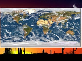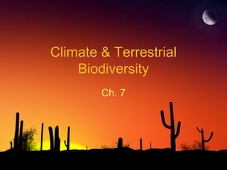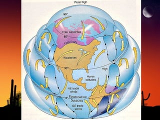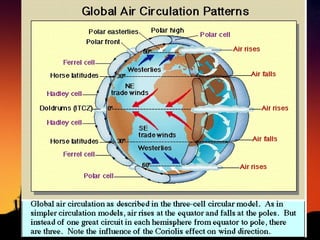 The document discusses factors that influence climate. It describes how air circulation driven by differences in solar heating across the Earth's surface creates global wind patterns. Ocean currents distribute heat around the world and interact with atmospheric circulation. Surface features like mountains also impact climate by influencing precipitation. All of these factors together define the world's major biomes by controlling temperature and rainfall in different regions.