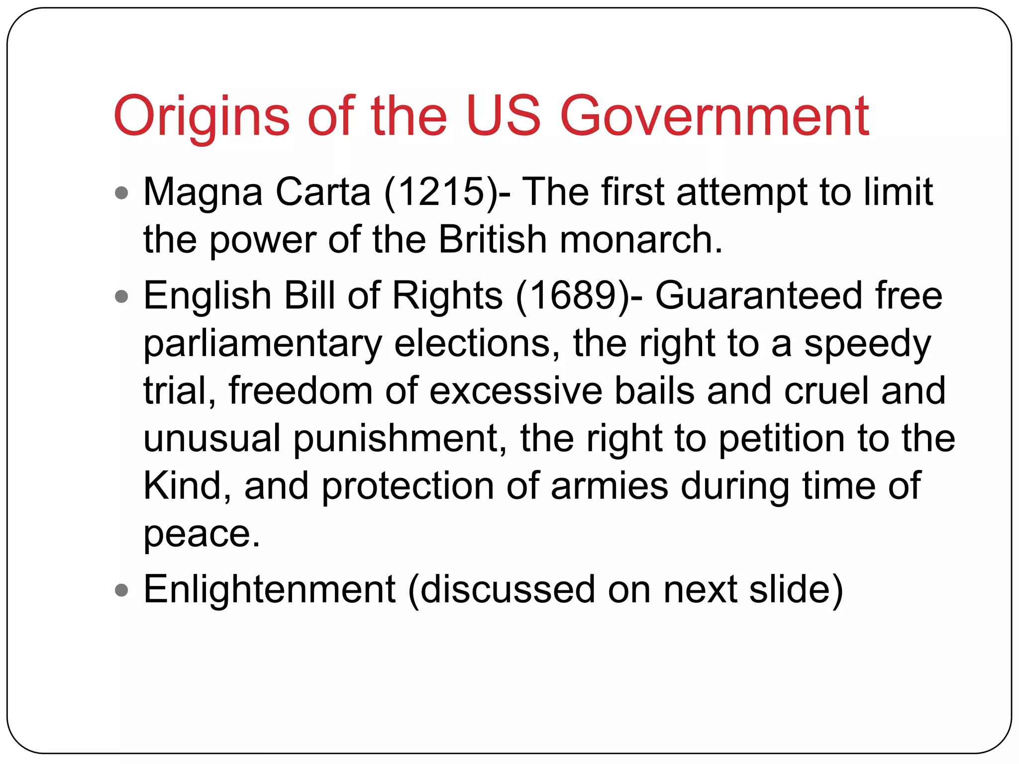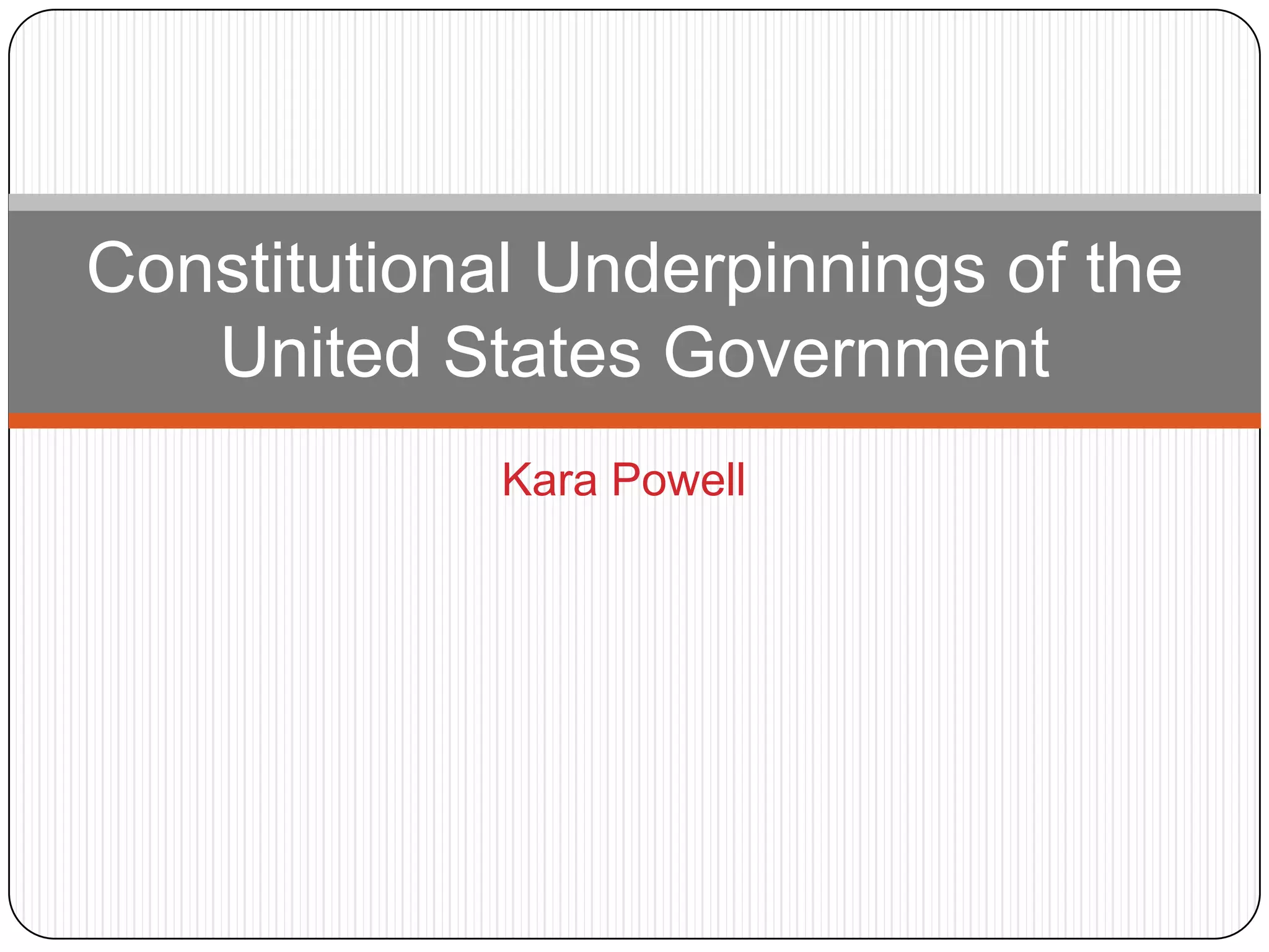 The document provides an overview of the origins and constitutional underpinnings of the United States government. It discusses key influences like the Magna Carta, English Bill of Rights, and Enlightenment thinkers including Locke, Montesquieu, and Rousseau. The document also summarizes the development of the US system of government from the colonial period, Articles of Confederation, Constitutional Convention, ratification debates, and key compromises and principles embedded in the Constitution like separation of powers and federalism. It also reviews the Bill of Rights and amendment process.