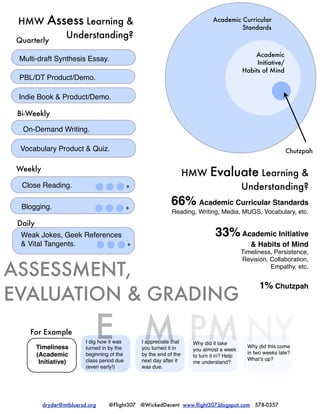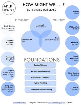 The document outlines the expectations and requirements for a high school AP Literature class, including necessary supplies and communication guidelines. It emphasizes the importance of academic initiative, timeliness, respect, and community building among students. Additionally, it includes procedures for assessment and the importance of various writing tasks and projects throughout the course.