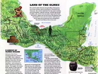 The document summarizes the Olmec civilization of Mesoamerica from 1500 BCE to 200 CE. The Olmec inhabited the coasts of the Gulf of Mexico in what is now Mexico and were among the earliest complex civilizations in Mesoamerica. They built cities and ceremonial centers with earthen pyramids and sculptures. The Olmec were ruled by priest-shamans and had a theocratic form of government. They practiced agriculture, especially of maize, and engaged in trade. The Olmec religion involved shape-shifting shamans and nature worship. Their calendar, ball games, and human sacrifice rituals influenced later Mayan civilization.